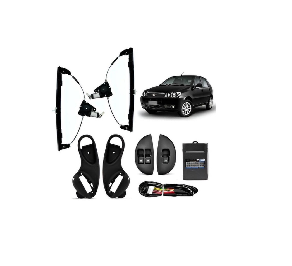 - Kit Vidro Eletrico Dianteiro - Fácil Instalação - Permite Acionamento dos Vidros Via Alarme - Chicote Anti-Chamas de Acordo Com Especificações do CONTRAN - Alivio de pressão alternado (Anti-vácuo) - Temporização de 1 Minuto. - Aplicação: Palio Fire 4 Portas